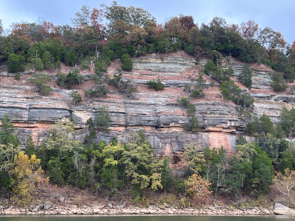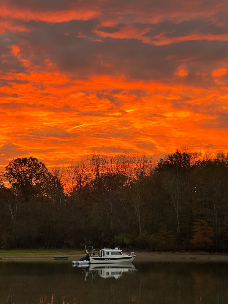 General summary: As we were preparing to head out of the creek in the morning, we noticed one of the two other much larger boats that had anchored near us was sitting still in the channel opening. They contacted us over radio and warned they were stuck aground as they had tried to motor out. Apparently the upriver dam had reduced water outflow overnight a great deal, dropping water levels. We were able to maneuver around their starboard side and were assured they were getting help. They had also contacted the dam operator about increasing flow, which might take 6-8 hours to make much difference. (I didn’t even know one could request this.) They were kind enough to send us a photo from that morning’s sunrise. Once out into the Tennessee River, we noticed it naturally narrowed and was meandering again, so little chop. Passed some barges. Lots of heron and egrets. Riverside rock views changing. Made it to Clifton Marina without any problems, got gas, took courtesy car to get groceries. Ate dinner at dockside restaurant – alligator poppers for appetizers. Seems we have developed a taste for them. Running in to other Loopers we have met before and enjoyed hearing about their adventures. New people, too. Heard the stuck boat had been able to get off ground and had motored on ahead.