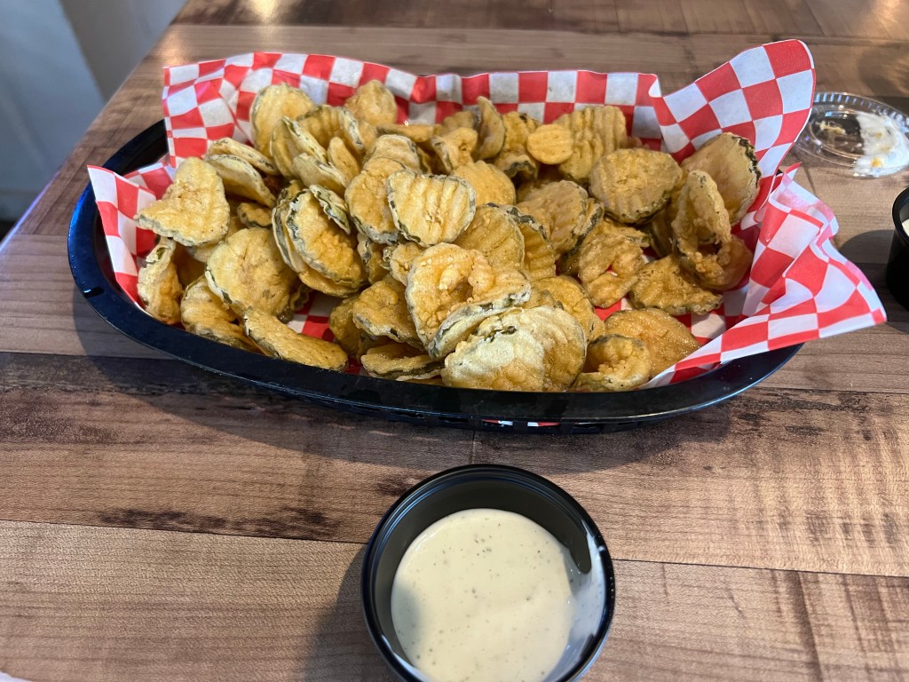 Ate dinner at the marina restaurant. Finally tried pickle chips for an appetizer, which we’ve been seeing on menus lately. Basically a salty excuse for dipping sauce, but glad we tried them.
