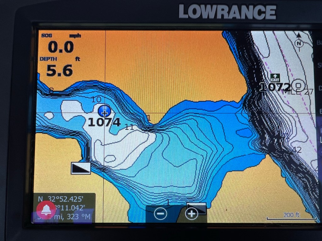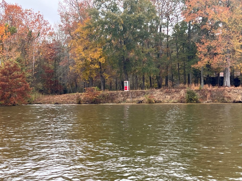 General summary: Flotilla planned to leave at 8 so we did breakfast, coffee, dog walk, filled water tank, and headed out. Nice to have a little extra time and light before leaving. Lock was only 0.5 miles away and we could see it from our slip. Lead boat communicated with the lock operators and we all kept in touch on VHF 69. Nine boats total passed through 2 locks without any issues or delays. We needed to schedule a mechanic stop for an oil change soon, which we arranged by phone to have done in Demopolis on Monday, so will anchor two nights before getting there. (One more thing to keep track of every 100 motor hours or so.) We passed from Mississippi into Alabama and will continue in Alabama through to the Gulf. Long day of motoring as we were the last boat in line and the forward boats preferred a pace of about 9 miles per hour. Was worth it! Views were pretty usual and it was raining, so not many photo opportunities, but we did pass a phone booth puzzlingly close to the river’s edge. There was nothing to tie up to and no good place to anchor there, so wouldn’t be placed there for boats. There was an RV park there, but not a good central spot for them either. Could this be a tardis or some way to tesser using an alternative dimension for an interstellar shortcut? (😆) Most of the group anchored at an inlet about 9 miles upstream from the lock. We wanted to go a little further to one that was next to a campground and had a boat ramp. Waterways guide predicted a 5 foot deep bar that required crossing, which we should be able to do. The flotilla warned us they heard it was now more like 3 feet. We decided to go ahead and try it as we could always backtrack. We took it super slow and it did go to 3 feet. We had a brief light bump with what was probably a sunken log, but no issues otherwise. Anchored in 10 feet with good swinging room. Took dinghy over and walked around the campground a bit. Rained hard in the evening.