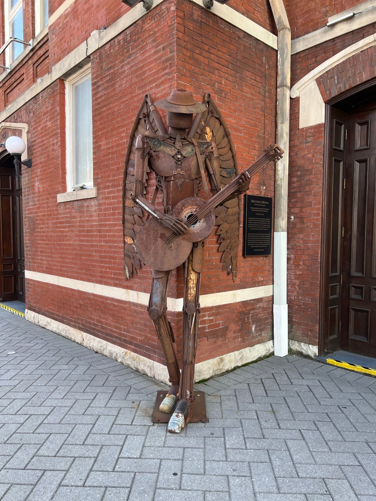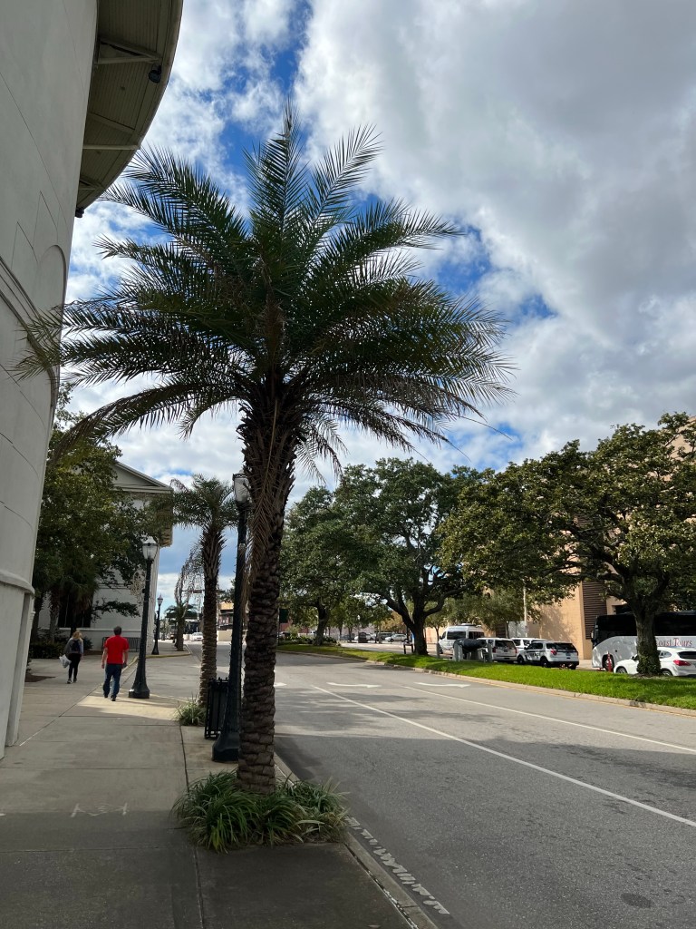 General summary: Today was HARD. Morning seemed to be going reasonably well. Usual breakfast routine. Took dog to shore and mud was much less of a problem as it was high tide and I found a grassy area that wasn’t too bad. Cold shower wasn’t fun but tolerable. After hauling up dinghy and preparing to leave, we attempted to pull up the anchor and it was absolutely stuck at 50 feet. Nothing we tried worked. Called Boat US and they were too busy for a non-emergency and suggested we try another company. Our policy doesn’t cover stuck anchors anyway. Most don’t. Called Sea Tow Marine and they advised us the cost would probably be more than buying another anchor, but the guy gave us numerous tips on how to try to get it un-stuck. We tried for an hour more – no luck. Best guess was it was probably wedged under or around a log. Progressed through the stages of grief and finally came to the conclusion we had to cut the line and order a new anchor and rode (don’t call it rope!). This will require about another boat buck. I was so proud of how much money we were saving by anchoring rather than staying at marinas. This will likely cost the equivalent of 20 marina stays. Sigh… Passed numerous barges on the way towards Mobile Bay and the captains seemed pretty crabby today. Lots of barges and large container ships to dodge as we approached the convention center in Mobile. Tying up to the rock wall was challenging. Current from tidal shifts, wake from passing boats, unusually large cleats, and a wall that was higher than our boat at low tide. Two attempts and finally got secured enough. Worked the lines and fenders (added a snubber to take some stress on the most important line as well) for about an hour until we felt safe enough. Then things got better. Decided to walk about downtown Mobile a bit. Warm enough for short sleeves and didn’t need a jacket. Had to lift Cocoa up about 6 feet to get her up on top of the wall, but she clearly enjoyed being off the boat for a bit and never likes being left alone. Nice park-like area just past the Convention Center. Walked up and down historic Dauphin Street. Bet this place is hopping at night.