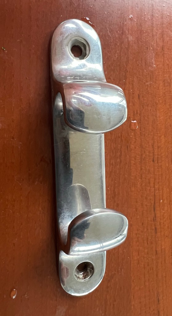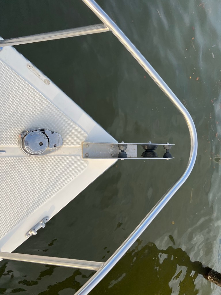 There were very strong winds overnight blowing directly into the marina channel opening, which we are moored near. This created a lot of wave action (remember fetch – it was blowing across the entire bay from West to East) making us bounce up and down from front to back this time. In the wee hours of the morning, we heard a metallic clang and ran outside to find one of the pieces that guides a mooring line on the bow (called a chock) popped off, its bolts shearing in half from the force of the line pulling on it. Fortunately there was no damage to the fiberglass deck. We were able to save the major metal piece as it hadn’t yet gone swimming. Hopefully it can be re-installed. It isn’t essential to tie up for the short term, but keeps the line from rubbing and stressing the railing in certain situations.