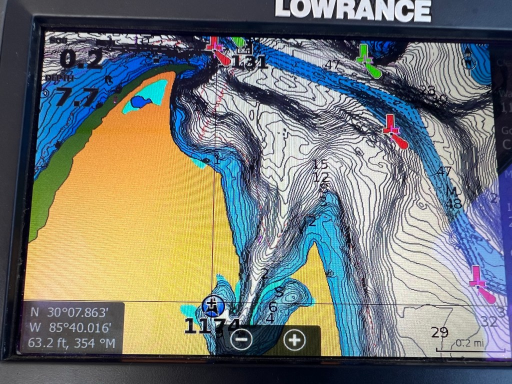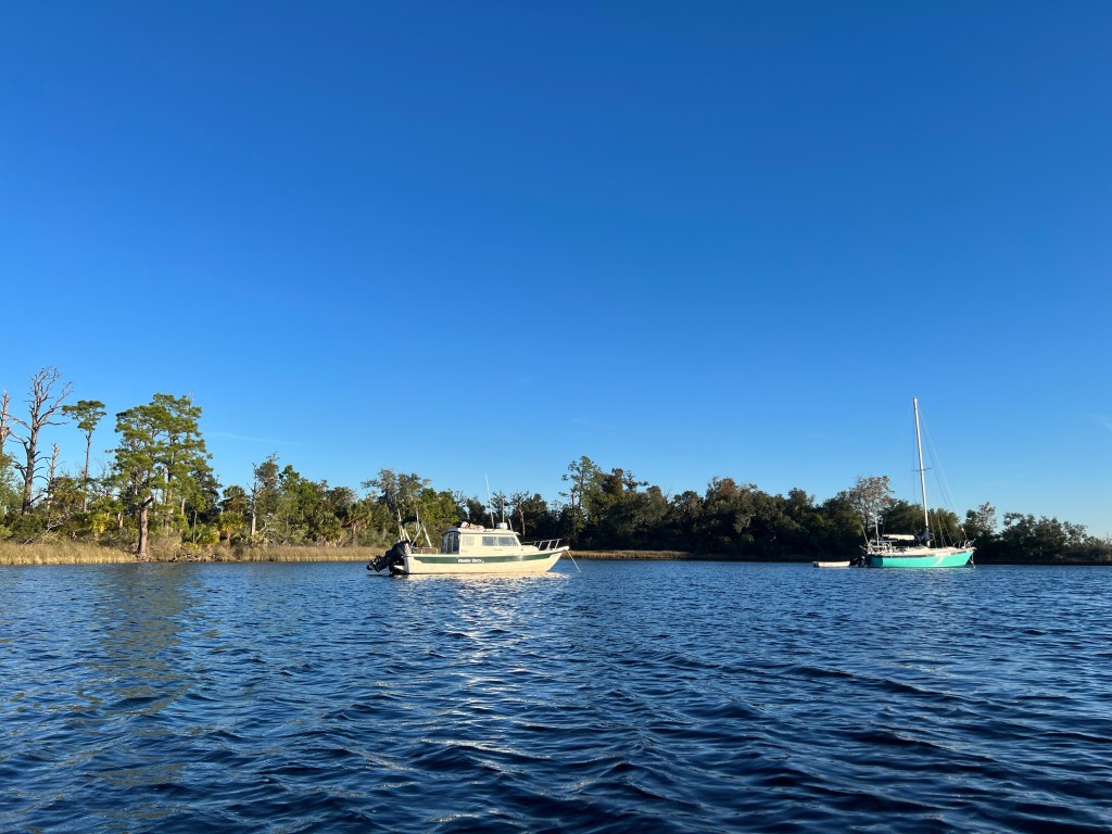 General summary: Wind was from the North, so quite a choppy ride in Choctawhatchee Bay. As soon as we got into the narrow channel approaching Port Washington on starboard it was smooth as glass. Then, upon exiting the channel and entering Grand Lagoon on the way to pass Panama City, the chop returned, but less intense. Turned into Smack Bayou and found a very nice protected spot to anchor for the night. Narrow sandy spit within dinghy rowing range for Cocoa’s needs. Saw a dolphin cruising around the boats in the evening. Hard to get a picture as you never know when and where they will pop up. Calm and quiet night.