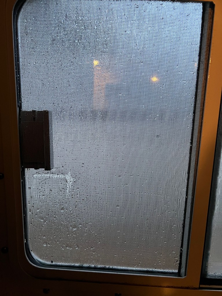 2) Tear in bathroom window screen from where dinghy oar handles pushed in during rocky Gulf crossing.