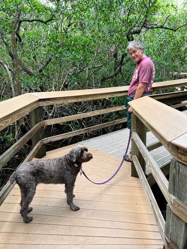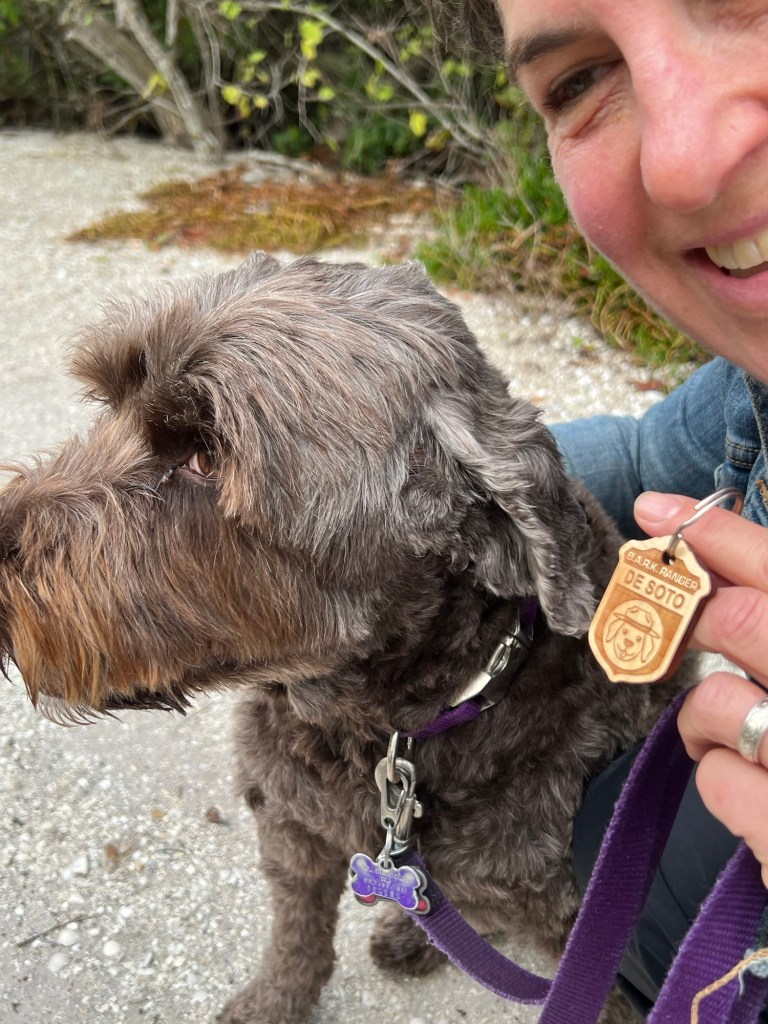 Took dinghy to land and walked on the trails in DeSoto National Park. Dogs on leash are welcome, so Cocoa enjoyed herself. Much of the trail follows the sandy beach, then there is a boardwalk through mangroves. There are informative signs about the Spanish explorer DeSoto and his crew from the 1500s, a visitor’s center, and historical demonstrations on weekends.