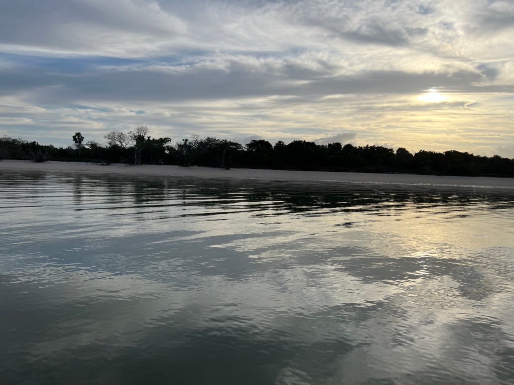 General summary: Water looked reasonably calm in the morning, so we pulled up anchor and motored. Long day and some periods of less comfortable chop, but made it to our desired anchorage. Waves appeared to be coming from South and wind from East, so we got as close to land as possible to block both. By evening, was calm and water flattened. Warned of gators in this area and advised to look for “slides” or paths worn in beach from gator bellies as they move to and from water and land. No slides or gators, but kept Cocoa on leash, just in case. Otherwise nice sandy beach walks. Warm and humid night. Screens mostly kept mosquitoes at bay.