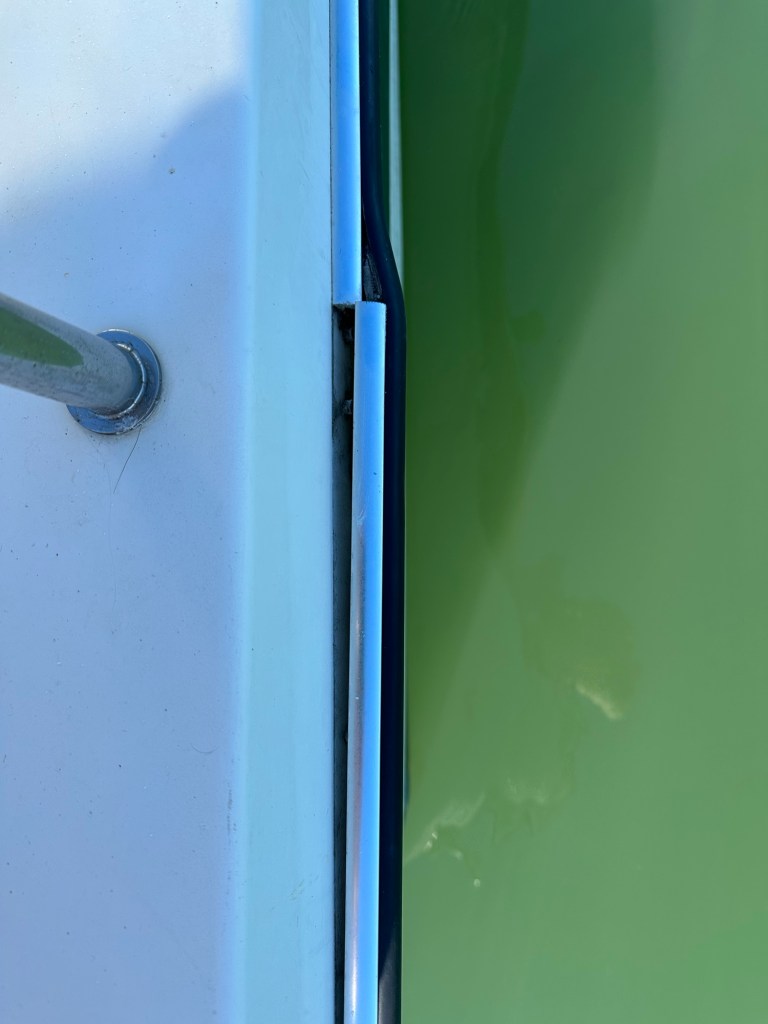 What broke: Rivets holding rub rail in place on starboard stern popped off, having corroded through.