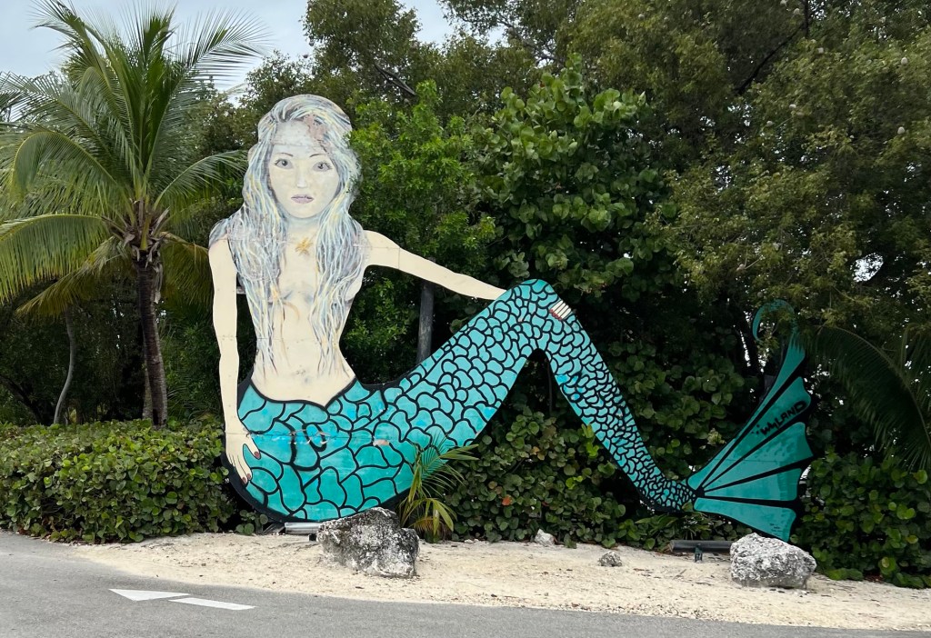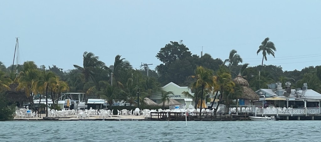 On our last day, the weather was warm and sunny enough to hang out in the stern of the boat in our bathing suits and we entered the water off the swim platform to get a swim and salty bath. That was just how I had pictured it would be in the Keys every day, but it has been unseasonably cool here this year. (I’m not complaining, just noting.) Really enjoyed it! Dinghied to Lorelei’s restaurant for happy hour that evening since we felt reasonably presentable after that. Had conch fritters, which were delicious.