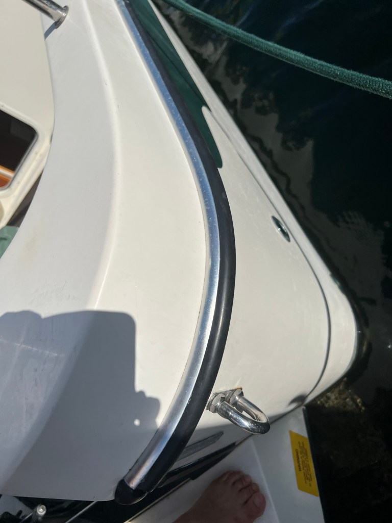 What was fixed: Rub rail. Tom got some stainless steel bolts to secure the metal piece (having to worm his way into the stern to hold the nut while I tightened the bolts from the outside) and pushed the rubber piece back in.