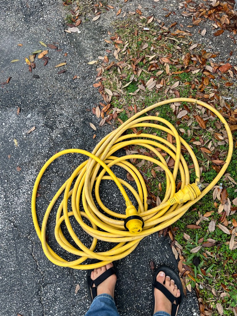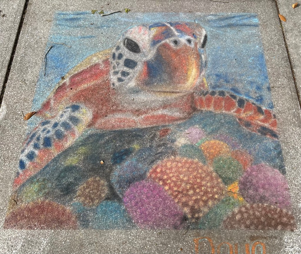General summary: One of the things we do as we are getting ready to depart a marina is detach the power cord from the dock stand on one side and the boat outlet on the other, then stow it until the next marina. Today, Tom had a hard time removing the plug from the boat outlet and noted darkening on one hole with some plastic melted. We let the marina manager know and they checked out their side – no issues. We have had this cord since we bought the boat, so it likely failed. We were not pulling much power, as we’d turned off the refrigerator and put all the food in the cooler. Only thing we used were lights, which are all LED. No fuses had blown or tripped. Ordered a new cord and outlet. Package will arrive at our next marina stop, so we’ll be on battery power until then, which will be fine. Motored on slightly choppy but not bothersome water to New Smyrna and tied off at their public dock, which you can do for up to 5 hours. Two docks are available, actually, but the North one was damaged (“hurricane”). Walked about town. Some nice shopping, but nothing we needed. Enjoyed the sidewalk chalk art.