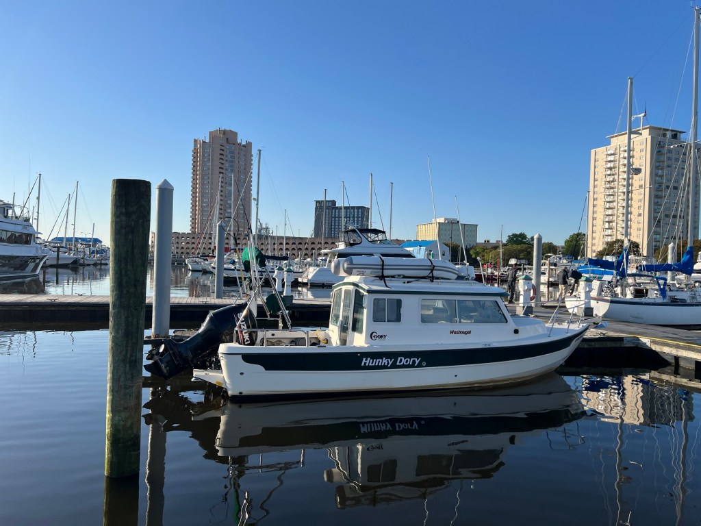 As we connected with the Elizabeth River going North, we were held up at a rail road bridge with only a 2 foot clearance for about an hour awaiting two trains to pass, then a section was lifted that we could motor through. Two more low RR bridges remained in the open position and we got to our next marina just before the office closed at 4:30. Interestingly, this turns out to be the same marina my dad stayed in 20 years ago when he did a trip South on the AICW on his sailboat.
