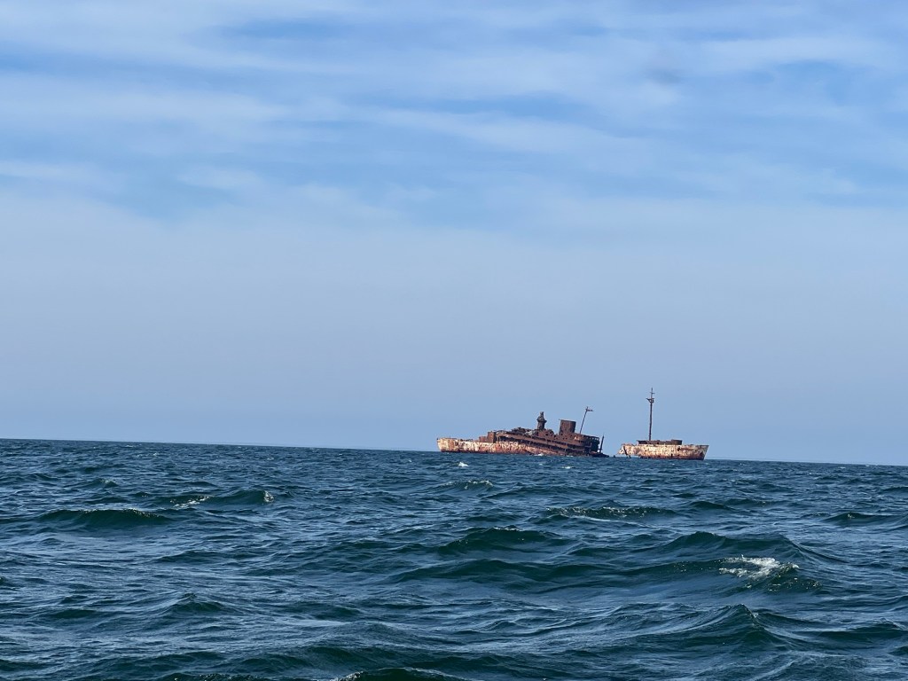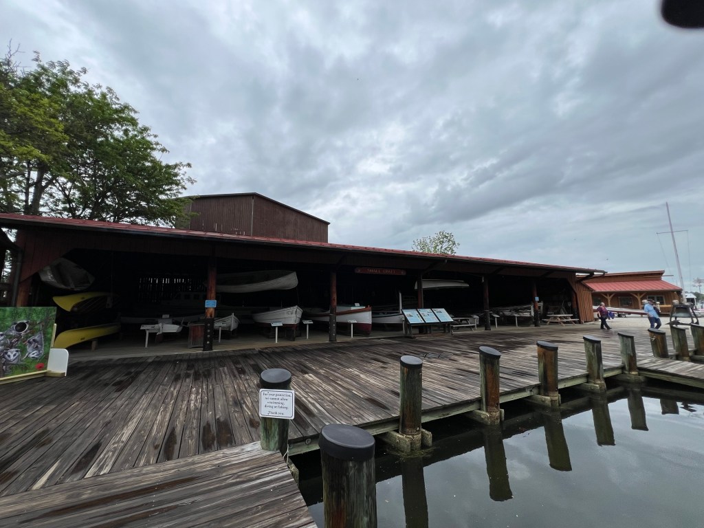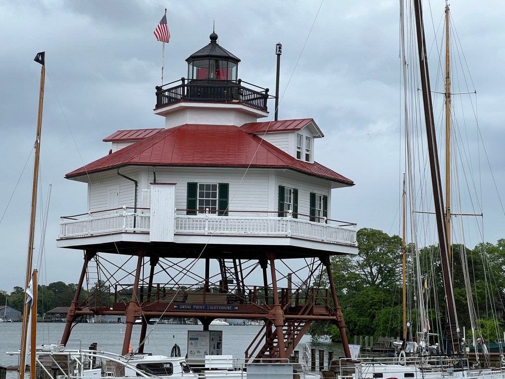 As General summary: We had been contacted via the Nebo app by the Harbor Host on Solomon’s Island and invited to stay at the local yacht club for a discount. He is a former Looper. This required crossing the Bay from East to West, which is a reasonably big body of water in this area. The wind prediction was a bit strong, but the direction appeared to be in our favor. Waves predicted to be 1 foot with 3 second period, which is just slightly choppy but tolerable. Unfortunately, the wind was a little stronger and in a bit less favorable direction in the morning. Ok when we headed directly West, with the wind and waves behind us, but we needed to go Northwest, so kept having to turn into the waves occasionally to get off of the Western shore and budge our direction North. Still no comparison to our Gulf crossing. On the way, we passed a structure which turned out to be a purposely partially sunken ship the Navy reportedly has used for target practice. There is a charted area around it that you are supposed to avoid (we did) due to metal fragments in the water. I’m told they no longer use ammunition, and just do simulated strikes now.