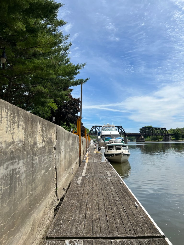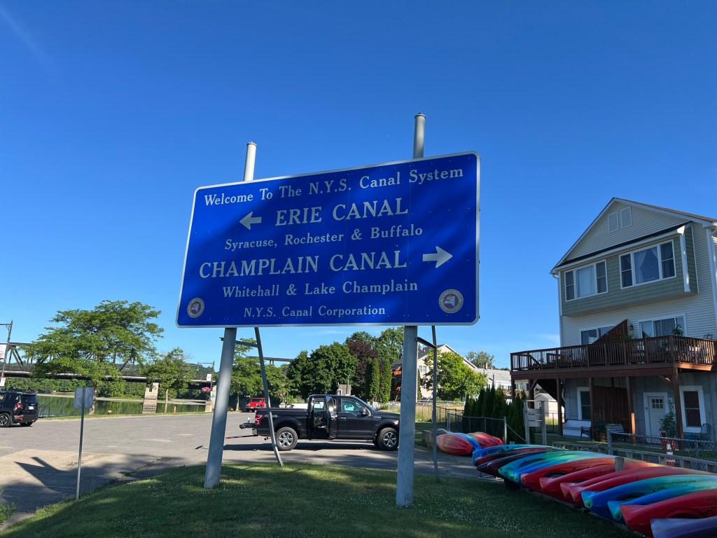 Motored on North to tie up at the free wall in Waterford, NY. This is where you can head West on the Erie Canal system to Lake Ontario or continue North on the Champlain Canal system to Canada. Both have fixed bridges, so boats that are too tall have to lower what they can to minimize their “air draft”. The Champlain canal has the lowest bridges, so fewer boats take it. Many sailboats had their masts “stepped” on the way here.