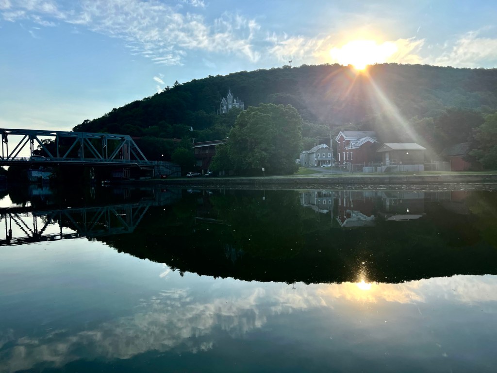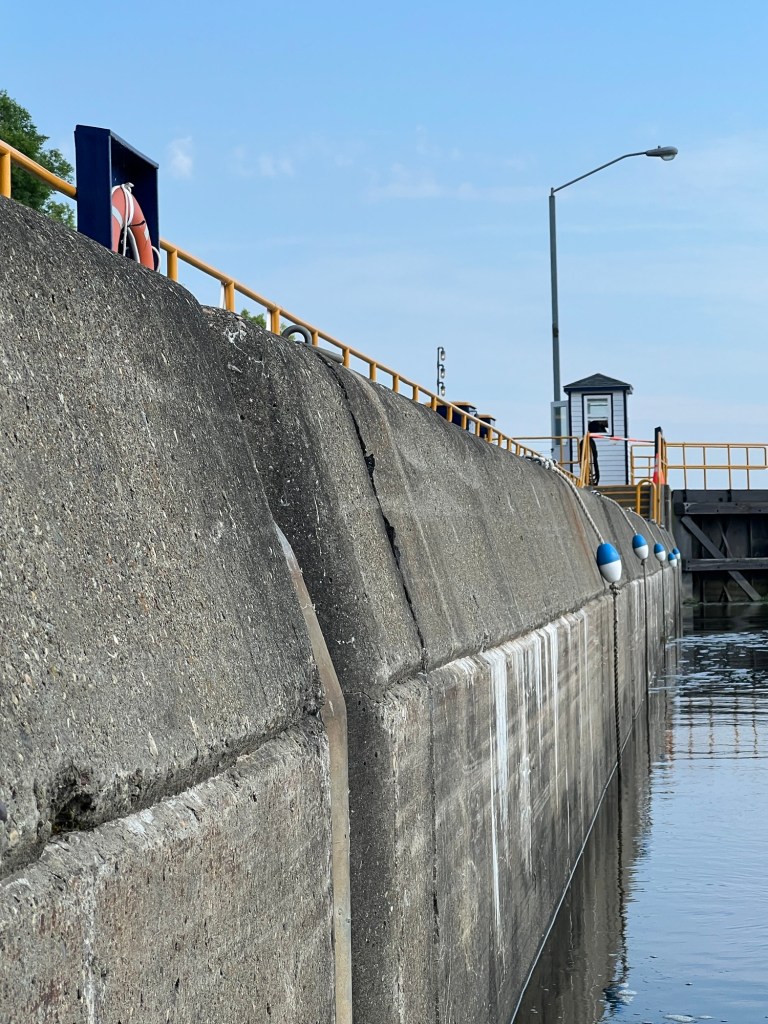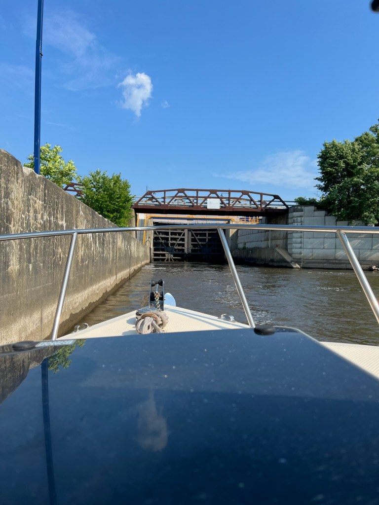 General summary: We backtracked a brief section of the Erie Canal to turn North on the Hudson for our first lock on the Champlain Canal. These locks are a bit different from what we experienced in the inland rivers (Mississippi, Tennessee, Cumberland, Ohio, and Ten-Tom) as the do not use bollards – basically floating cleats that you tie off to that rise and fall with the water level in the lock. These locks have ropes, cables, and pipes you can use. Took a little bit of practice to get used to them. We planned on getting through 6 locks, but they were so efficient that we went through 10. The Champlain Canal locks are numbered 1-12 but there is no 10, for no clear reason. We ended just before lock 12, the last until we were at the water level of Lake Champlain, as there was a free wall with power at Whitehall, just a few hundred feet from the last lock. Tied up there with 3 other looper boats and made plans for a coordinated flotilla locking through the next day. Didn’t spend much time in town. The local museum is only open on weekends until 6/28.