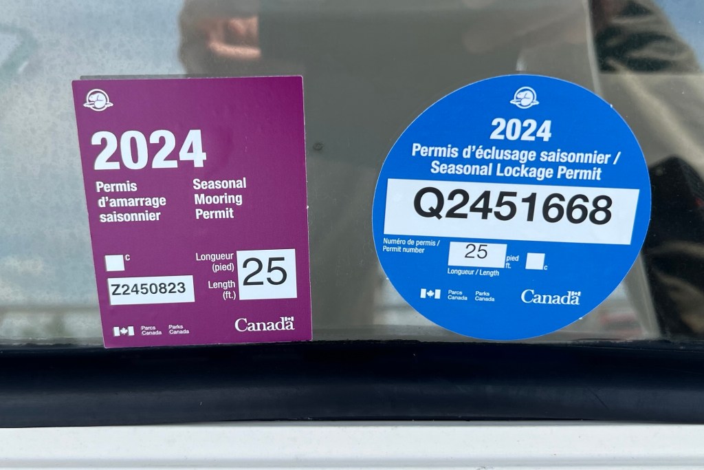 We stopped for the night just before the end (really the start, for us) of the Chambly Canal. We had previously purchased a locking pass and mooring pass for the season and so now affixed them to our center windshield. There are numerous canal systems in Quebec and Ontario and these cover the cost of locking through and also for staying overnight at various docks and walls along the way. You can’t reserve a spot, but once you confirm your arrival at a spot with the lock operator, you can stay.