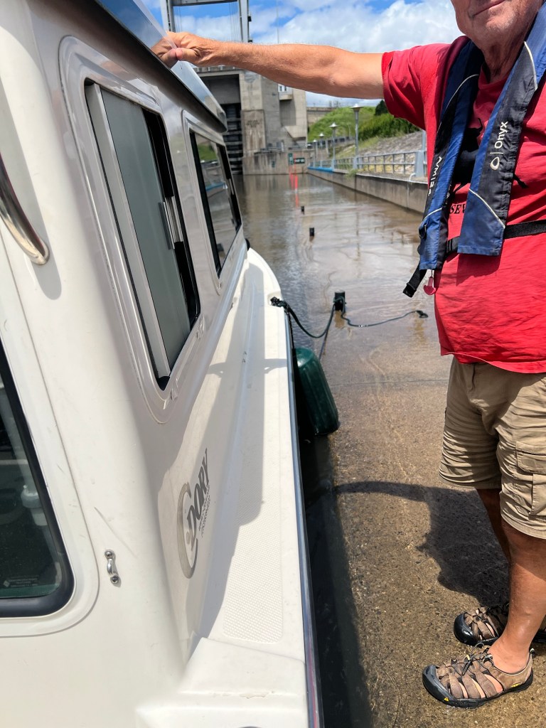 The next lock was at Carillon on the Ottawa River. As we approached, we noted orange pipes sticking up vertically at the grey concrete wall, which seemed to indicate we shouldn’t go there. It appeared to be under water. There were none on the blue line concrete wall, so we assumed it was safe to tie to, though it looked like the water level was somewhat high there as well. There did not appear to be an option on the other side for securing our boat. We radioed the lock master of our approach, and were answered in French. Unable to understand, we proceeded to the blue line. Well, the water was high enough that our fenders just floated on top of the concrete. As a result, there was nothing to cushion us. Despite a slow speed, we heard a crunch and immediately felt sick. Once we got out and examined the side of the boat it turned out the gelcoat had been damaged, but the fiberglass interior looked fine. We finally got a response from a lock operator who spoke English and were advised we could tie up to wires on the other side if we wanted. Too late.