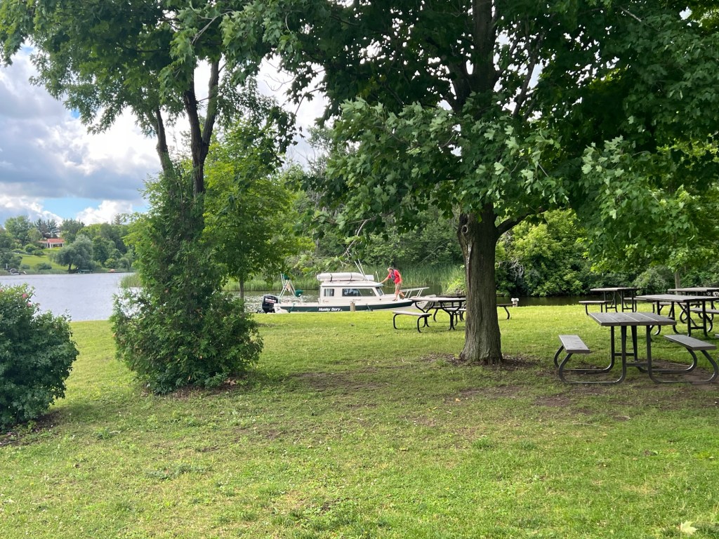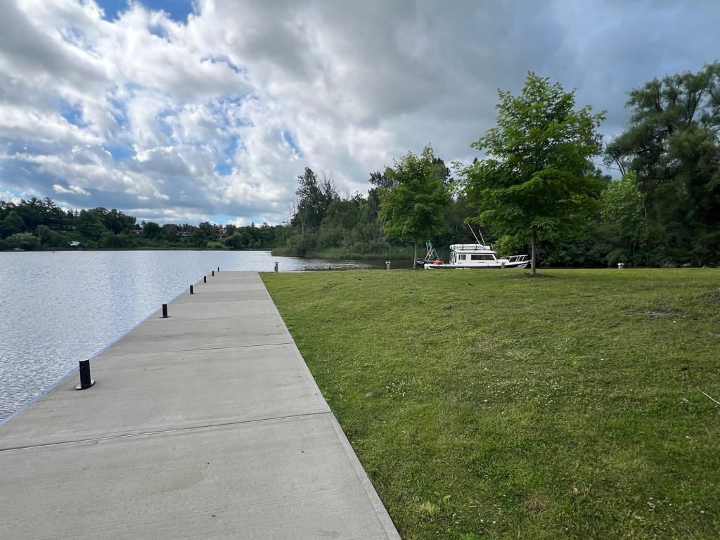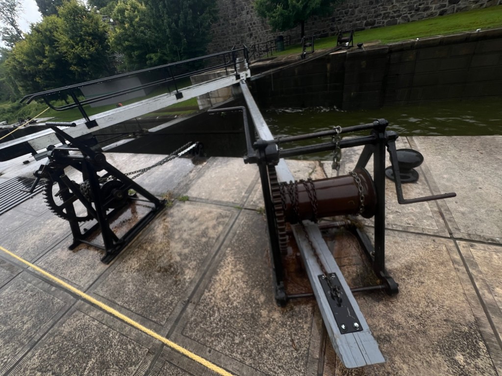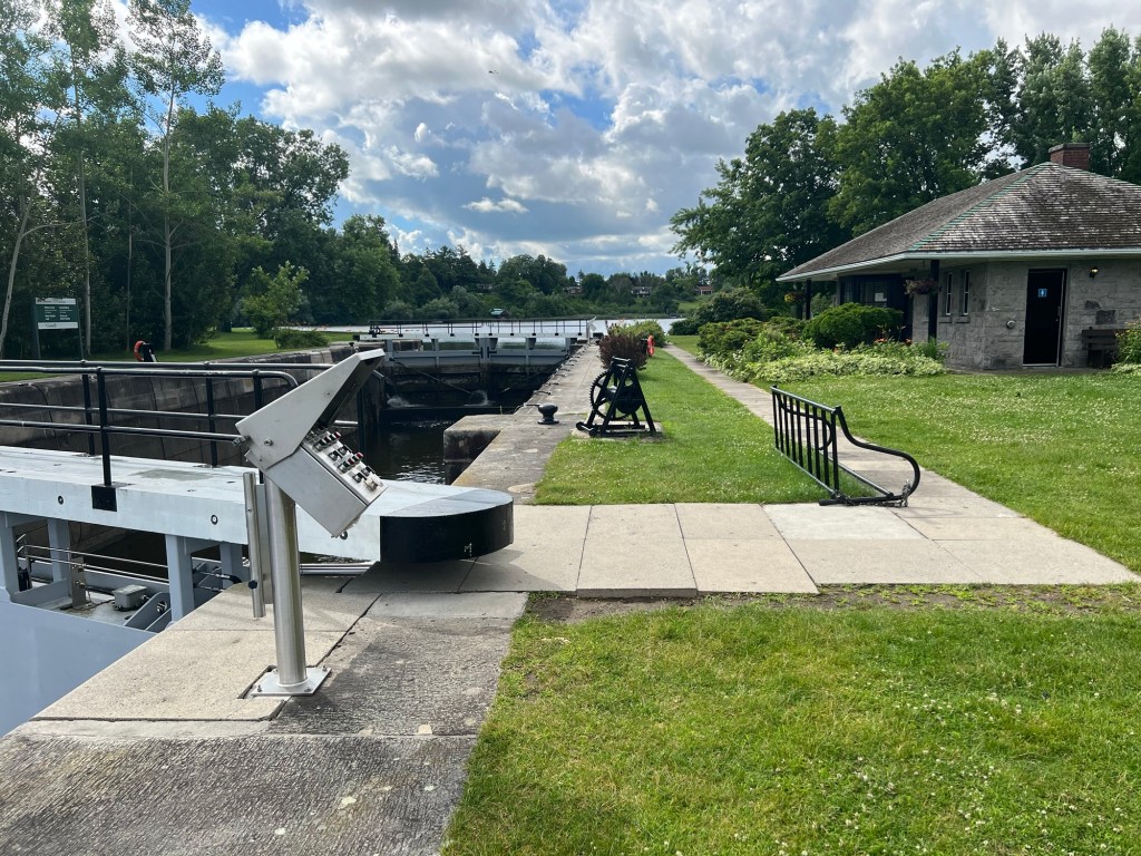 Left the wall in Ottawa in the afternoon and went through several locks to Black Rapids. There was a nice grassy area and a lock-keepers house. Two other boats tied up and it was a quiet night.