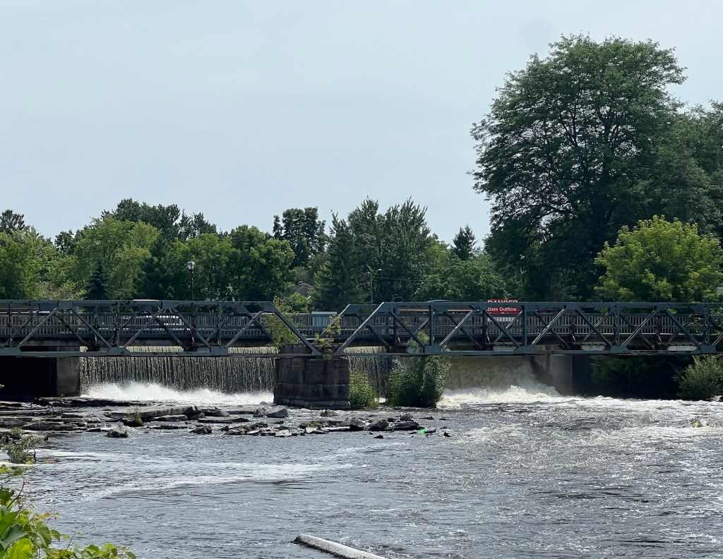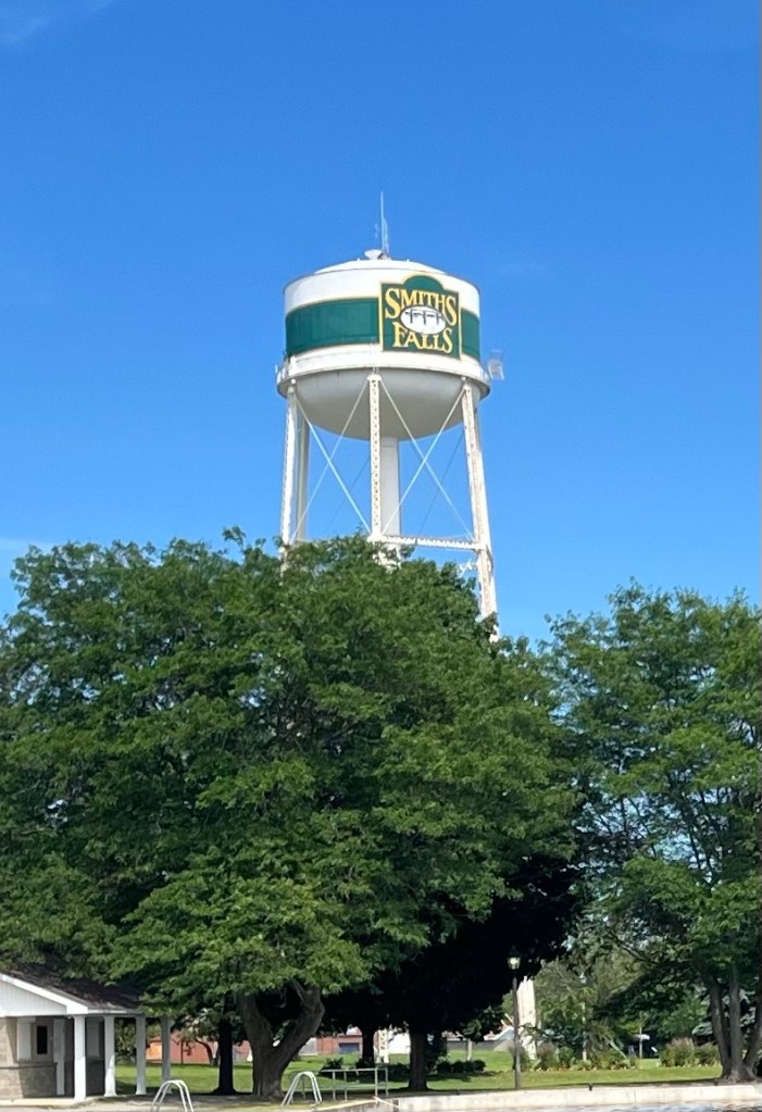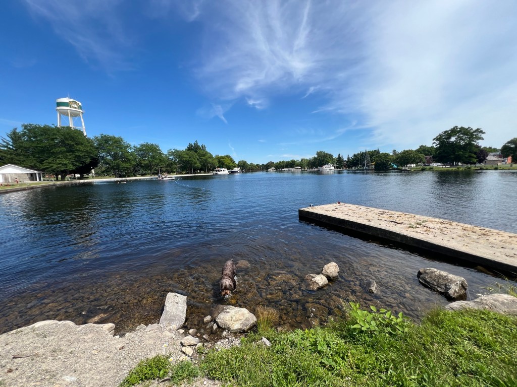 General summary: Motored on, through more locks, to Smiths Falls. The best place to stay the night is on one of the walls surrounding the pond created between the two locks that flank it. Walked into town and got food, then took Cocoa to the swimming beach.