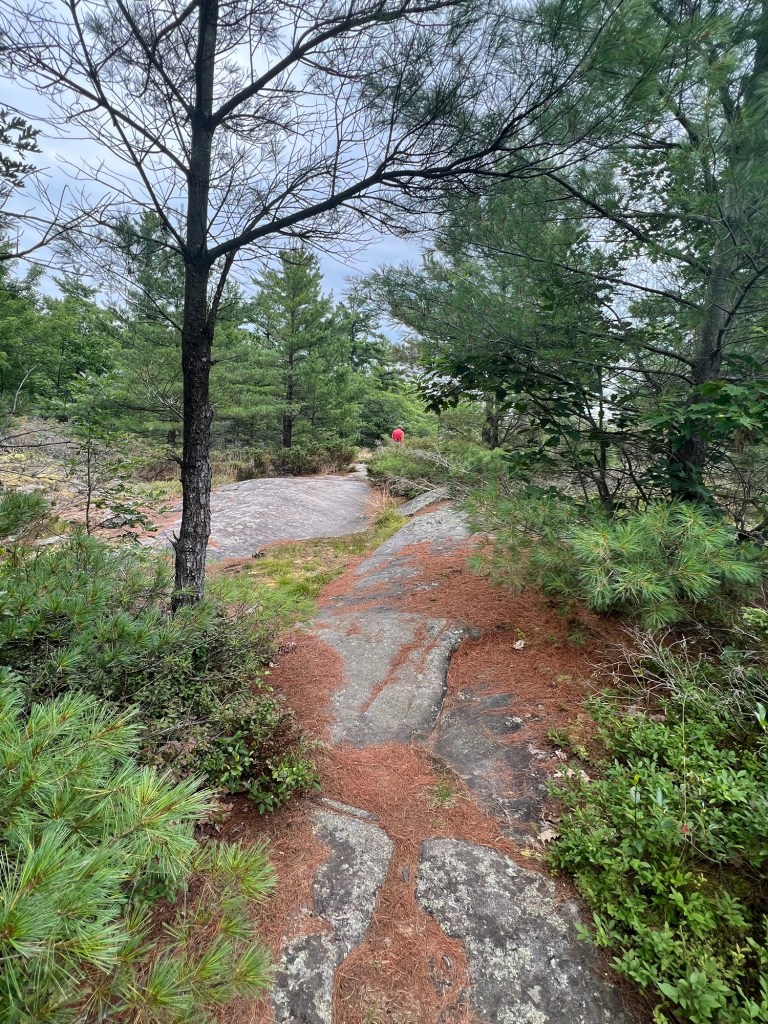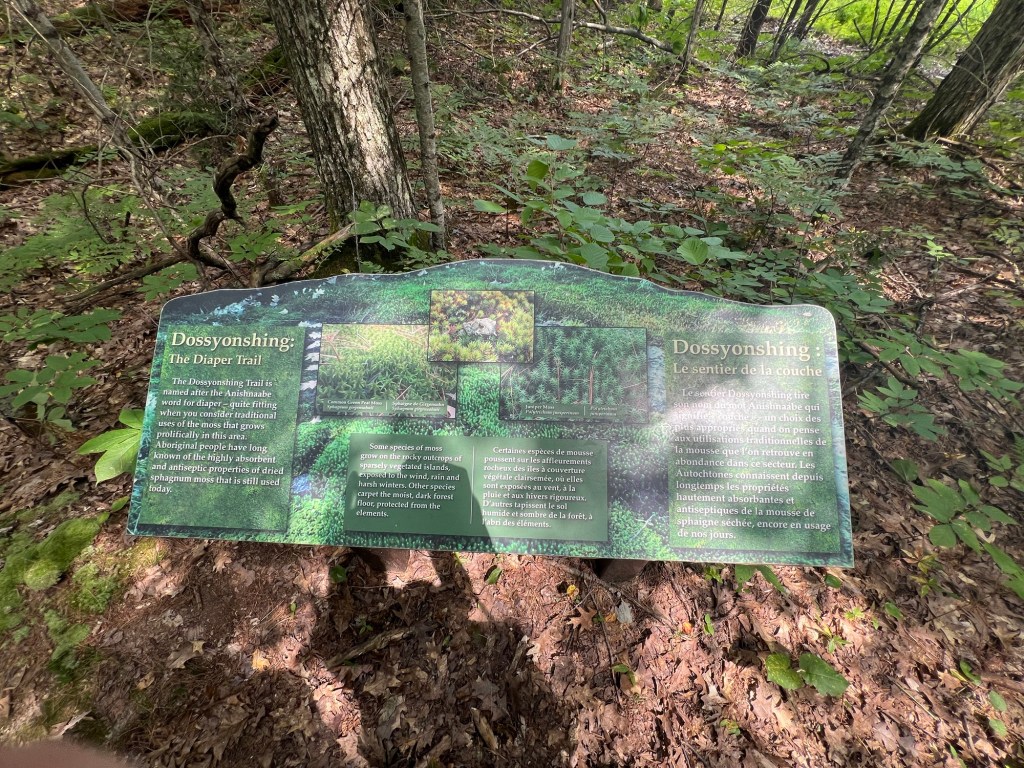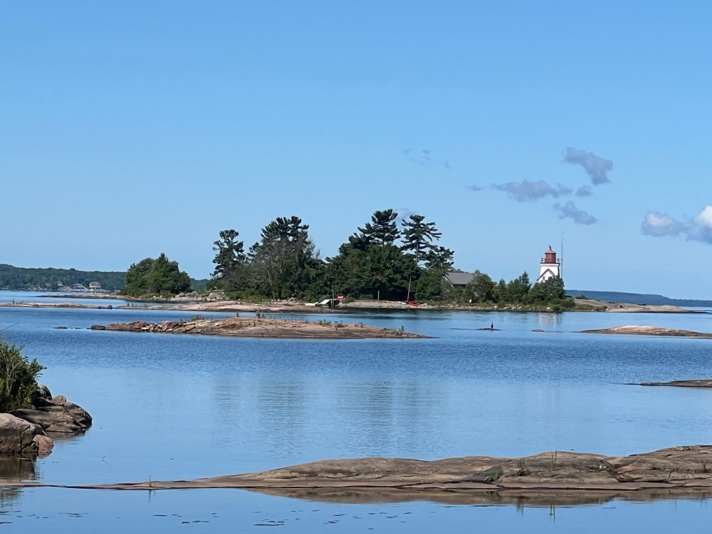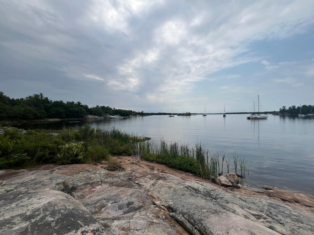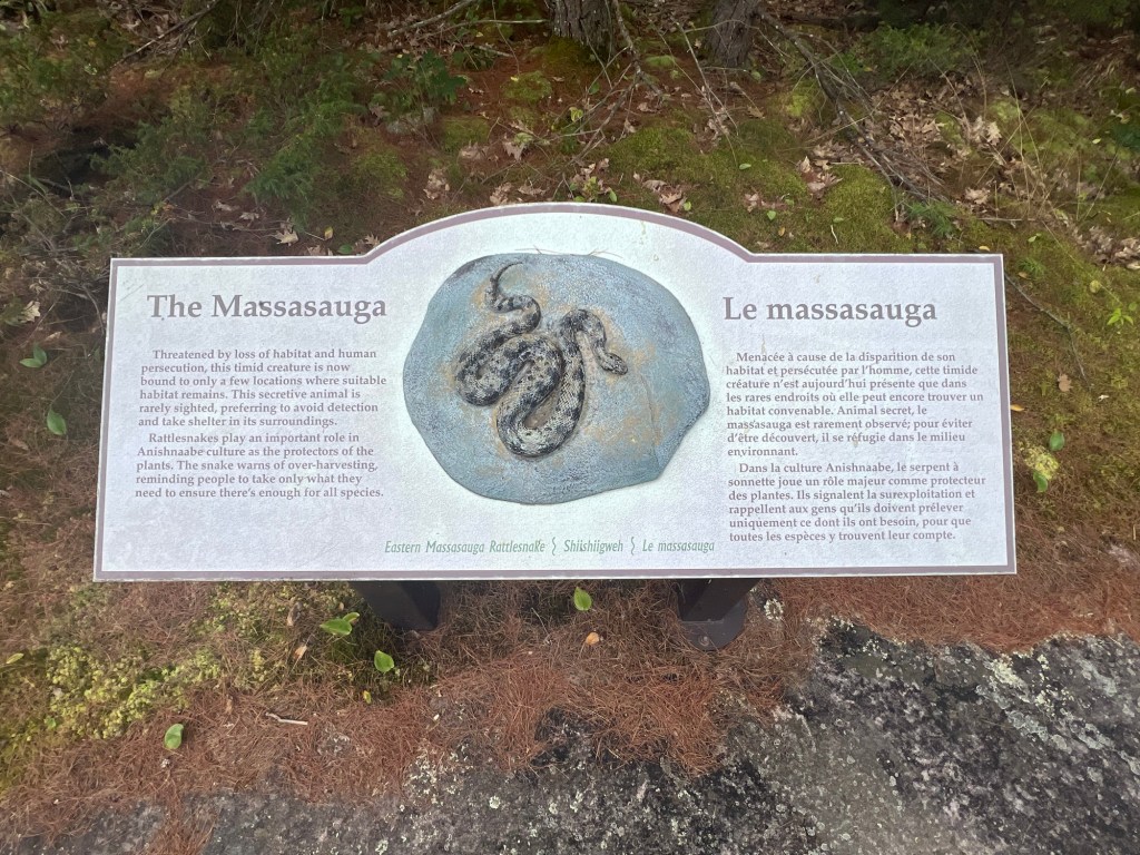 General summary: Our next destination was Beausoleil Island. It is the last Parks Canada-supported area that has public docks covered by our mooring pass. Also a logical close stop just West of the end of the Trent-Severn Waterway and North of Midland. We spent two nights on the rocky Southern end at Thumb Point exploring the Huron trail (very swampy and full of mosquitoes) and Georgian trail (more rocky and windswept, with few bugs) on day one. On the second day, we hiked the middle section to a lighthouse and back, erroneously traipsing through a private YMCA camp. We thought we’d have to spend the next night at a marina to charge our batteries, but a taxi boat delivering a camper from Honey Harbor gave us free bags of ice (an advertisement effort for Maple Leaf associated marinas), so we were able to put our food into the cooler and turn off the refrigerator, then motor to Oaks dock and spend the night without draining them too much. On the fourth day, we did motor to Honey Harbour to stay at the Bluewater Lodge and Marina to power and provision. Was rainy and windy anyway, so a good day to be moored. On the fifth day we got our first taste of the “small craft channel” (at times super narrow and tortuous between rock outcroppings, but well explored and marked with reasonable safe dephths) to reach the North end of the island, which was much more forested. Also got to meet the namesake of the Massasauga trail, the local rattlesnake, as well as an observant owl.
