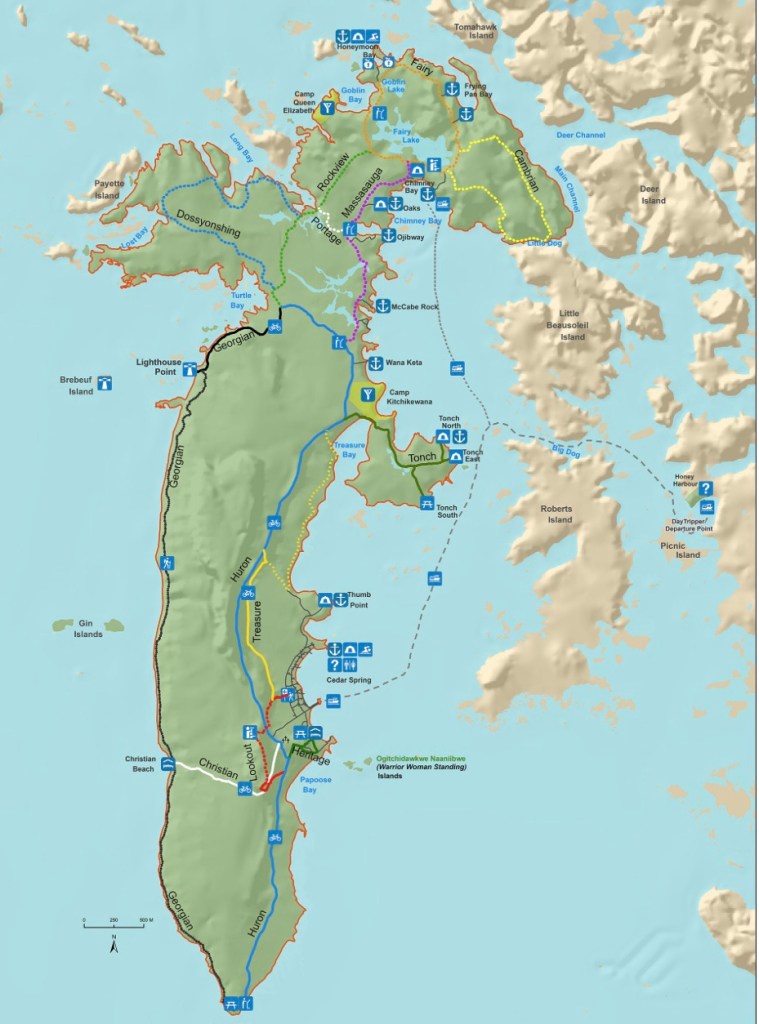 Ending location: Beausoleil Island State Park Docks (Thumb Point, Oaks, Frying Pan Bay), with an overnight stopover in Honey Harbour to provision on 7/24.