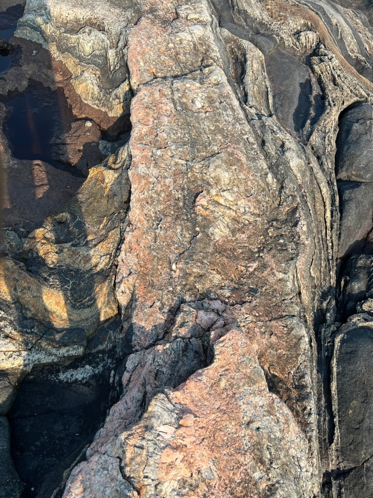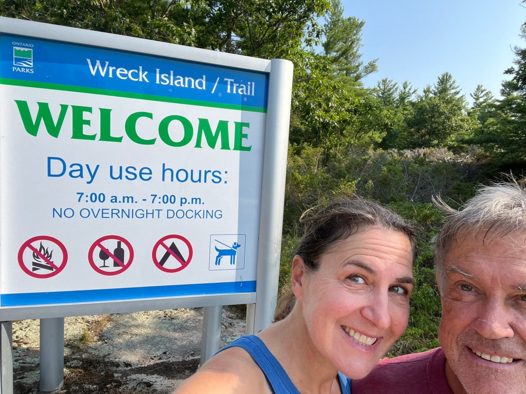 General summary: We pulled up anchor and motored back out of Go Home Bay and meandered around to Wreck Island, named after the wreck of a steamer (the Wabuno) during a late November storm in 1879. There was an excellent 1.5 km trail with nine well-marked interpretive points to stop and learn about the Parry Sound Greenstone Geology of the area. Much of this rock is over 1 billion years old and likely was at the base of a sea, then lifted up over years through tectonic forces, then re-exposed through repeated glaciation and erosion. Got some good exercise and education. Then, we anchored nearby for the night. One benefit of having so many rocks of various sizes popping out of the water is the net effect of wind blocking. There are numerous well-protected spots for anchoring.
