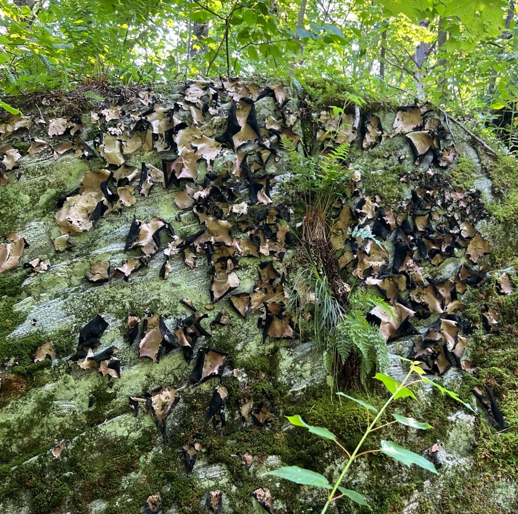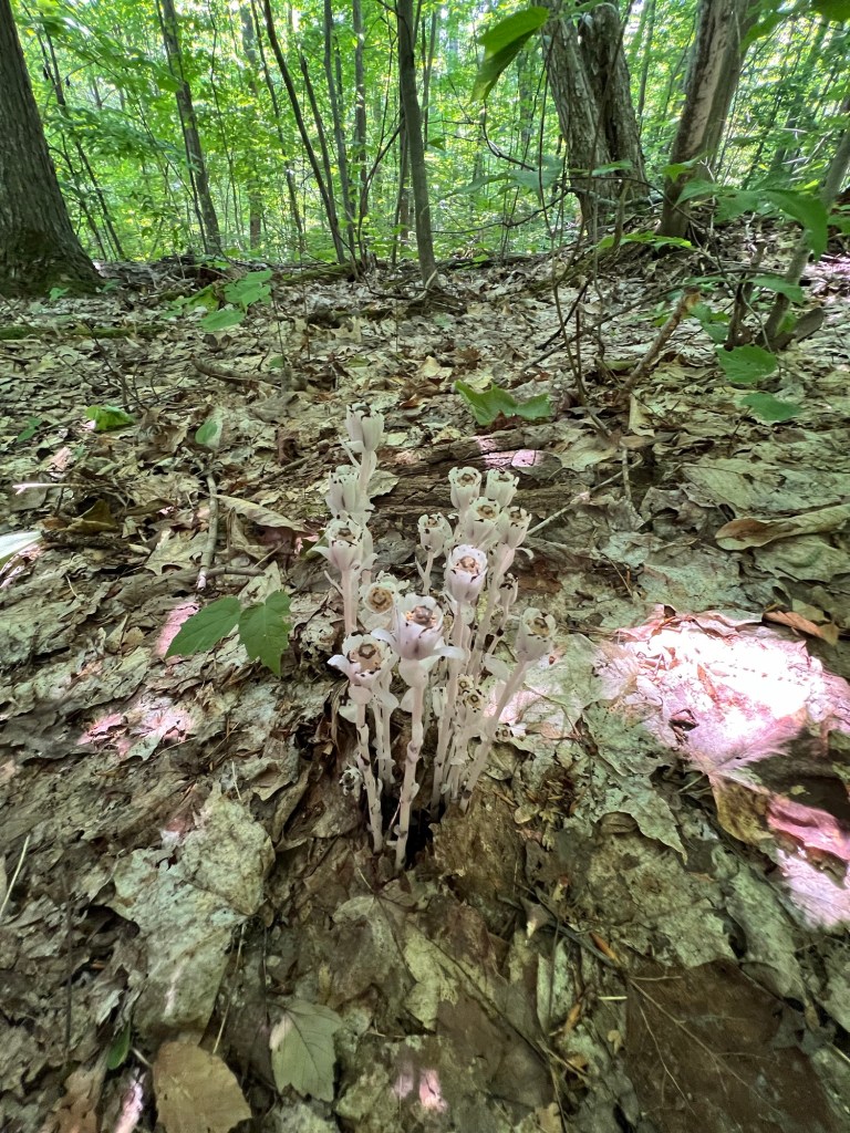 Welcome sign. Great dinghy dock. Well blazed trailThis plant is nicknamed Indian Pipe. It is ghostly white as it does not contain chlorophyll, and gets all its nourishment from the fungus it attaches to on the forest floor. This is an adaptation, due to lack of sunlight coming through the dense canopy.A tree growing out of a broken rock. American Beech, Sugar Maple, Yellow Birch, and Eastern Hemlock are common trees. Many migratory birds come here in the spring and summer. There are turtles and a lizard called a Common Five-lined Skink. We did not see any Massasauga rattlesnakes, but they reportedly are here too.Close upThese brown paper-like objects attached at their centers to rocks are a type of lichen called Rock Tripe.