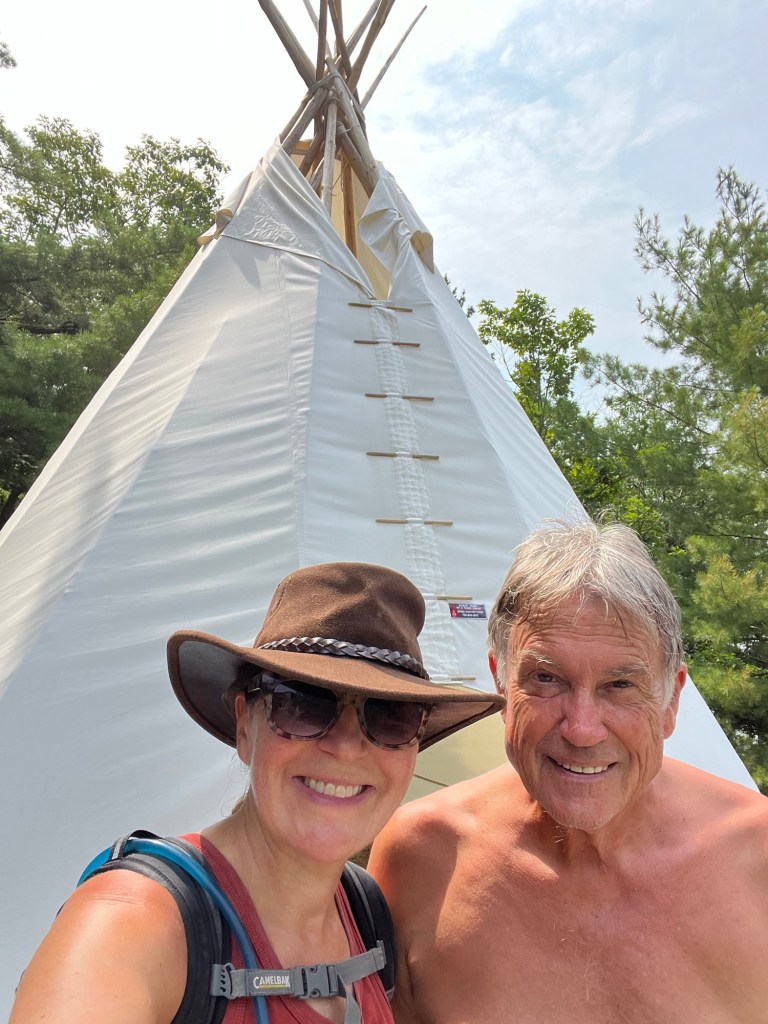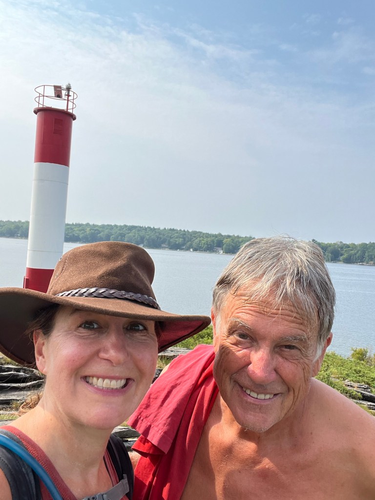 General summary: Motored out into Parry Sound, which was surrounded by land but surprisingly deep and wide, which led to a little unexpected wind and chop. We anchored and things calmed down by the afternoon. This is a popular campground that has several sandy swimming beaches. We dinghied to shore and walked about the campground (many busy RV and tent sites) and then did a hike over pink hued rock to a light station. The visitor’s center is marked by a teepee, well seen from shore, as this is Indigenous land. There is a minimal charge for coming onto land that goes to the native population. Went swimming off the boat a couple of times, which was so refreshing in the continued heat and humidity.