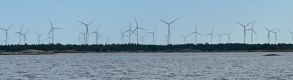 General summary: Trying to reach The Bustards again. We’ve nicknamed them “The Bastards”, not to be disrespectful, but because they have been so challenging to get to. What a difference a day makes. The wind speed had decreased further and the direction had changed from West to North, so there was less fetch, and therefore chop, in our location. Also, the small craft channel, known as “Hangdog Channel” as we turned NW from Bying Inlet was more protected again. Then, we exited out to the Bay going directly Westward and spied rows and rows of windmills behind us. With the wind we encountered the previous few days, that location makes complete sense. Near flat calm today. Made it easily to the cluster of small islands somewhat out in the open Bay. There is an area of navigable water in the center that made a perfectly protected anchorage for about a dozen boats. Took the dinghy down to explore the nooks and crannies. We were surprised to find that, even out here, there were a few small cottages.