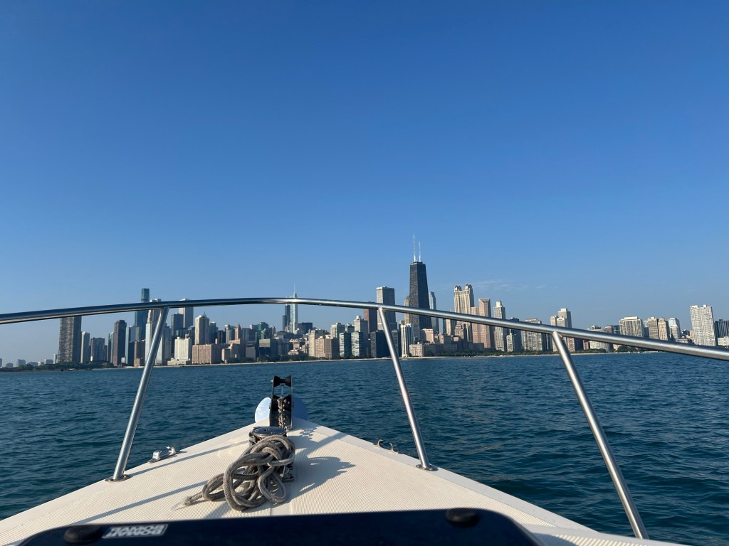 General summary: The winds were coming from the Southwest, but since we were close to the Southern border of Lake Michigan, there would be less fetch and hopefully smaller waves hitting our bow. We pushed on straight through to Chicago. Not our most comfortable ride, but certainly not our worst. We could start to make out the skyline about 20 miles away and watched it grow larger and more detailed as we approached.